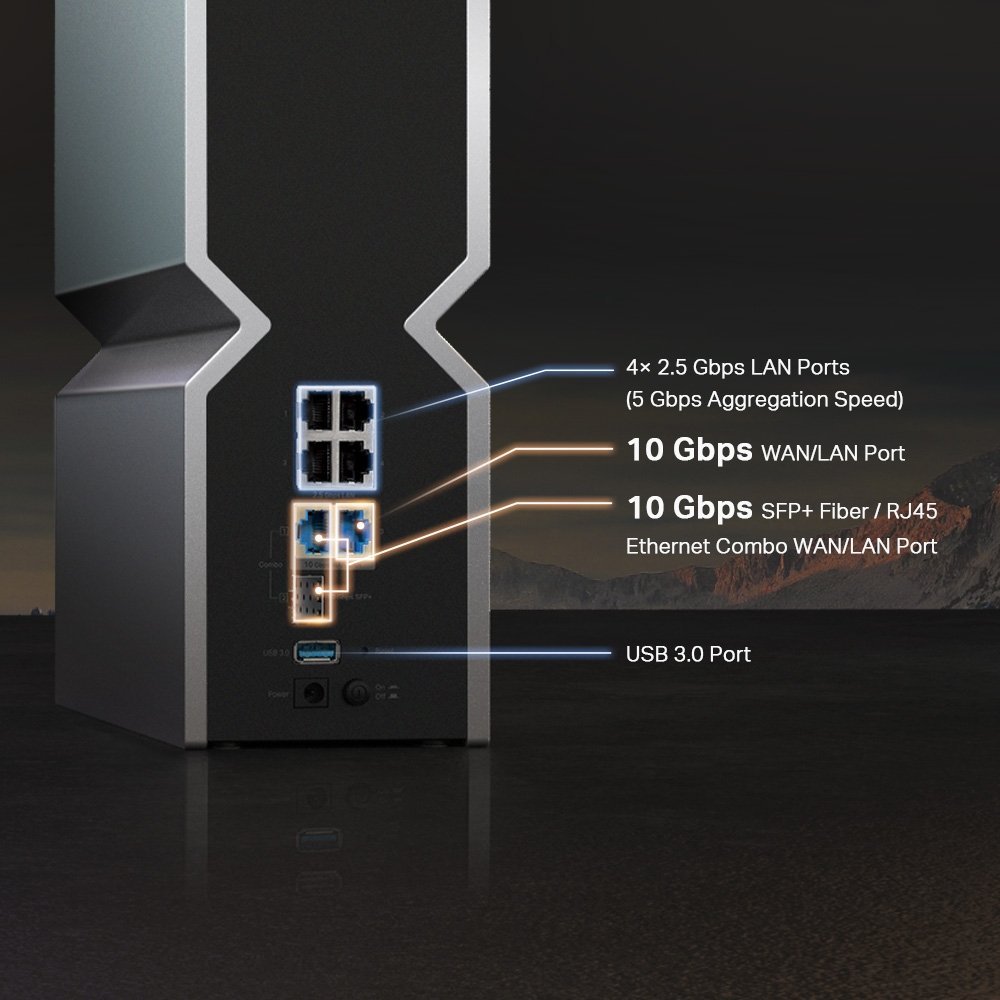 Dual 10G Ports: 1× 10 Gbps Ethernet/Fiber Combo WAN/LAN port + 1× 10 Gbps WAN/LAN port + 4× 2.5 Gbps ports + 1× USB 3.0 port ensure max flexibility and boosted throughput.